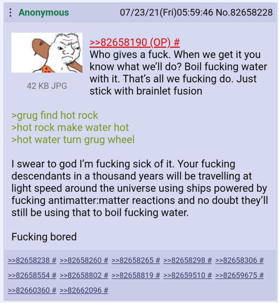 I'm looking for a screencap of the thread this or last year of some anon freaking out over learning basically all power plants and methods of generating electricity are just various ways of heating water to turn a turbine with steam.