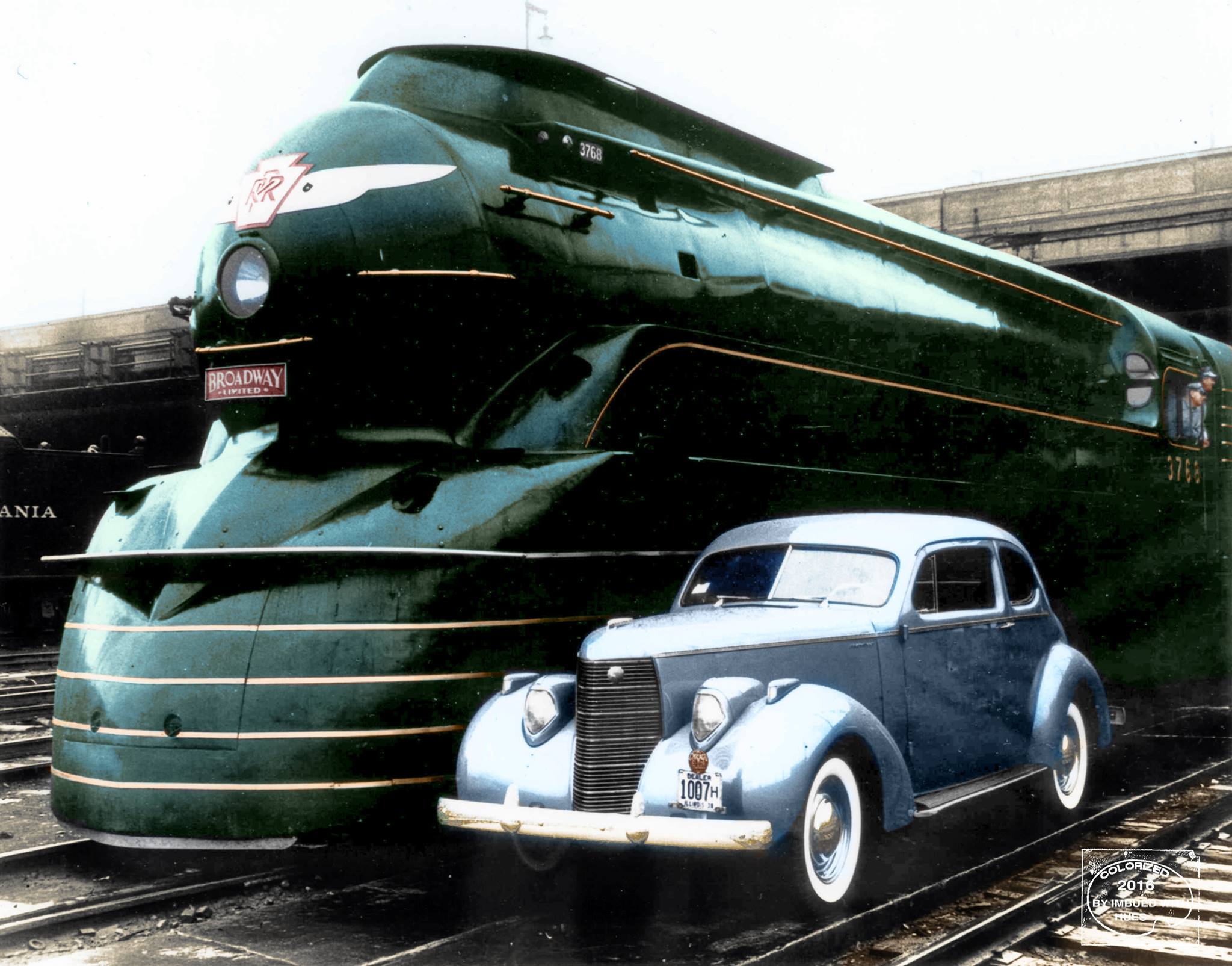 This is Pennsylvania Railroad 3768, a K4-class locomotive that was rebuilt with a custom streamlined covering designed by Raymond Loewy. It was perhaps most famously showcased alongside B&O's William Mason and the Best Friend of Charleston at the 1939 World's Fair.